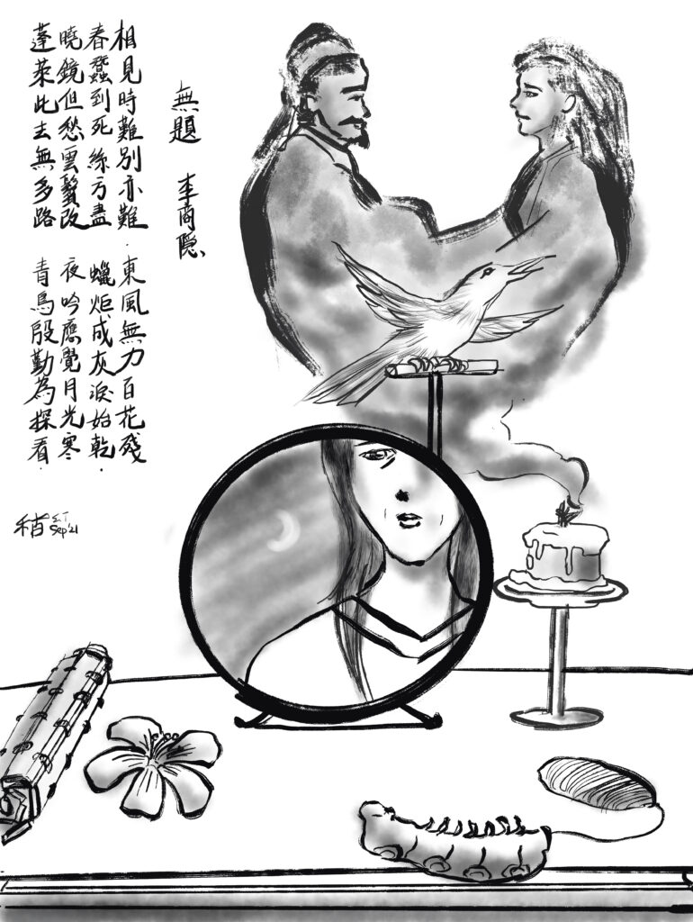 Creation video (~2min) 無題 李商隱相見時難別亦難東風無力百花殘春蠶到死絲方盡蠟炬成灰淚始乾曉鏡但愁雲鬢改夜吟應覺月光寒蓬萊此去無多路青鳥殷勤為探看