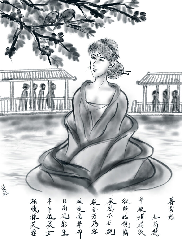 Creation video (~ 3min) 春宮怨, 杜荀鶴早被嬋娟誤欲歸臨鏡慵承恩不在貌教妾若為容風暖鳥聲碎日高花影重年年越溪女相憶採芙蓉