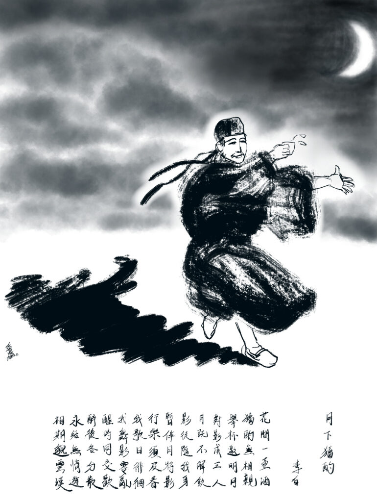 Creation video (~1.5 min) 月下獨酌, 李白花間一壺酒獨酌無相親舉杯邀明月對影成三人月既不解飲影徒隨我身暫伴月將影行樂須及春我歌日徘徊我舞影零亂醒時同交歡醉後各分散永結無情遊相期邈雲漢