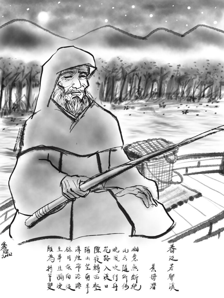 Creation video (~2 min) 春泛若耶溪, 綦毋潛幽意無斷絕,此去隨所偶。晚風吹行舟,花路入溪口。際夜轉西壑,隔山望南斗。潭煙飛溶溶,林月低向後。生事且瀰漫,願爲持竿叟。