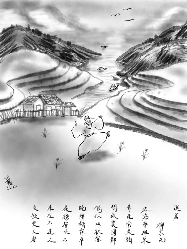 30 sec creation video 溪居, 柳宗元久爲簪組束,幸此南夷謫。閒依農圃鄰,偶似山林客。曉耕翻露草,夜榜響溪石。來往不逢人,長歌楚天碧。